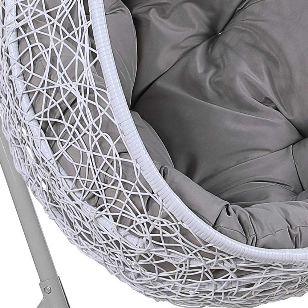 Материал плетения на корзине: искусственный ротанг белого цвета. Подушка серая. Ткань с водоотталкивающей пропиткой.