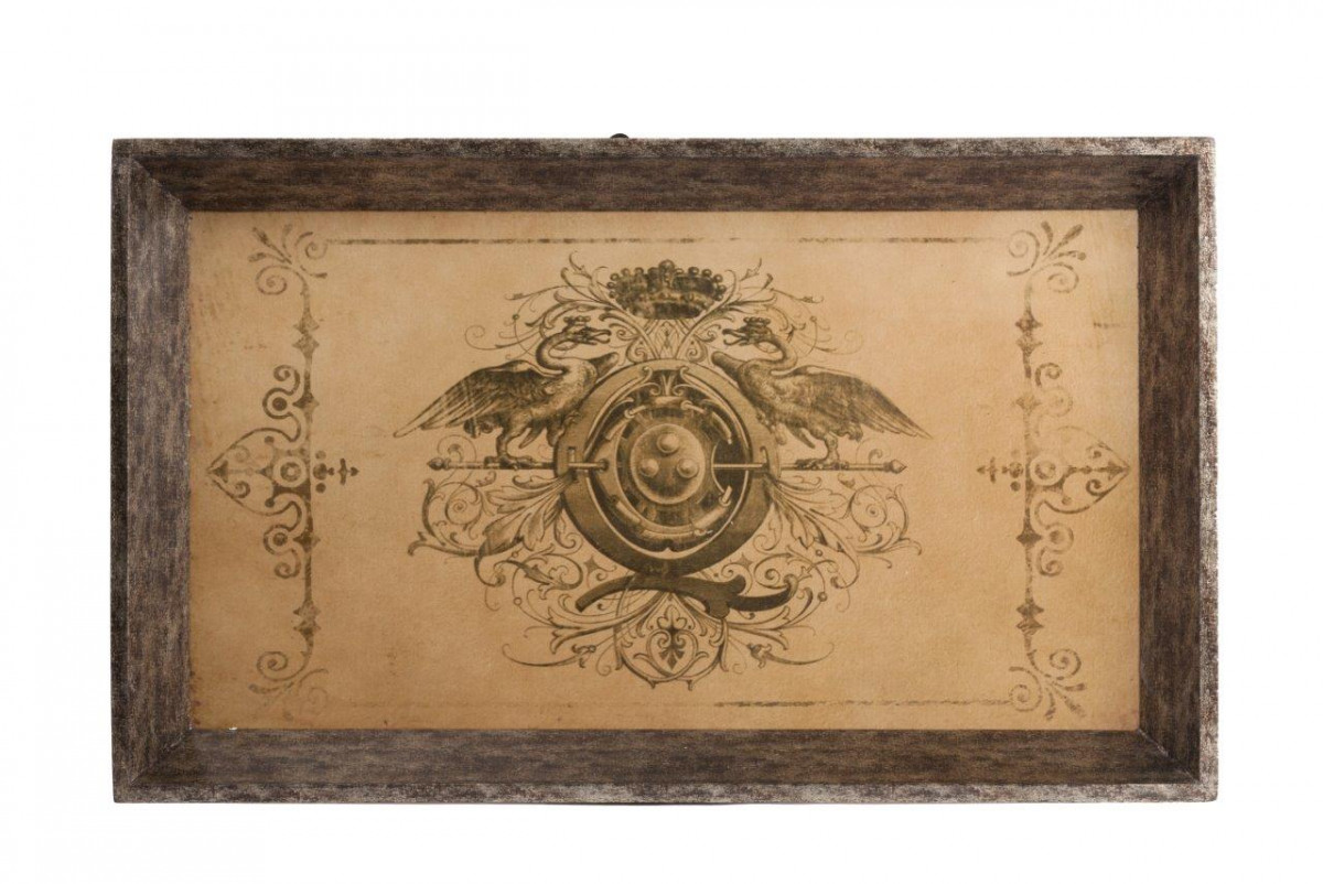 Декоративный поднос Respeto One в стиле Прованс, прямоугольной формы изготовлен из МДФ. Поднос декорирован изображением старинного герба и геральдической символикой в сером цвете на бежевом фоне.