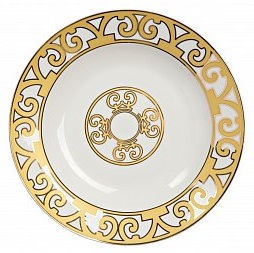 Великолепная тарелка для супа из костяного фарфора серии «Marbella» придется по вкусу ценителям элегантной роскоши. Выполненная из полупрозрачного белоснежного фарфора, тарелка украшена золотым орнаментом в стиле модерн moderne. Изысканная окантовка дополнена солярным символом в центре изделия. Вы можете приобрести эту тарелку отдельно или в комплекте с другими предметами серии «Marbella».