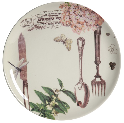 Тарелка Mois диаметром 18 см изготовлена из грубой керамики с нанесением разноцветного рисунка, на котором изображены столовые приборы, цветы, бабочки. Тарелку можно приобрести отдельно или в комплекте с другими столовыми предметами из коллекции. Благодаря фантазийному рисунку, тарелка может стать самостоятельным элементом интерьера кухни или столовой и украсит любой дом.
