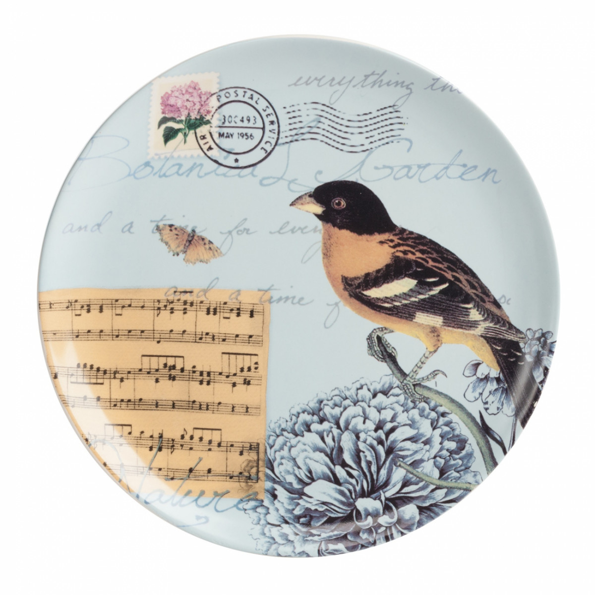 Тарелка Montecito Turquoise выполнена из грубой керамики в голубом цвете. По всей поверхности нанесен рисунок в виде соловья и нот, а также почтовая символика в виде штемпеля и печати. Тарелку можно приобрести как отдельно, так и в сочетании с другими предметами этой коллекции.