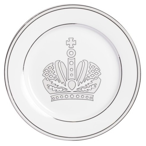 Тарелка изготовлена из высококачественного белого фарфора. По краю тарелки проходит окантовка, дно украшено великолепно прорисованной короной в светло-сером цвете. Тарелка декорирована весьма элегантно, и заслуживает внимания покупателей.