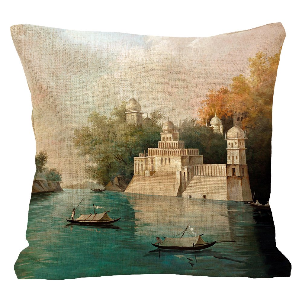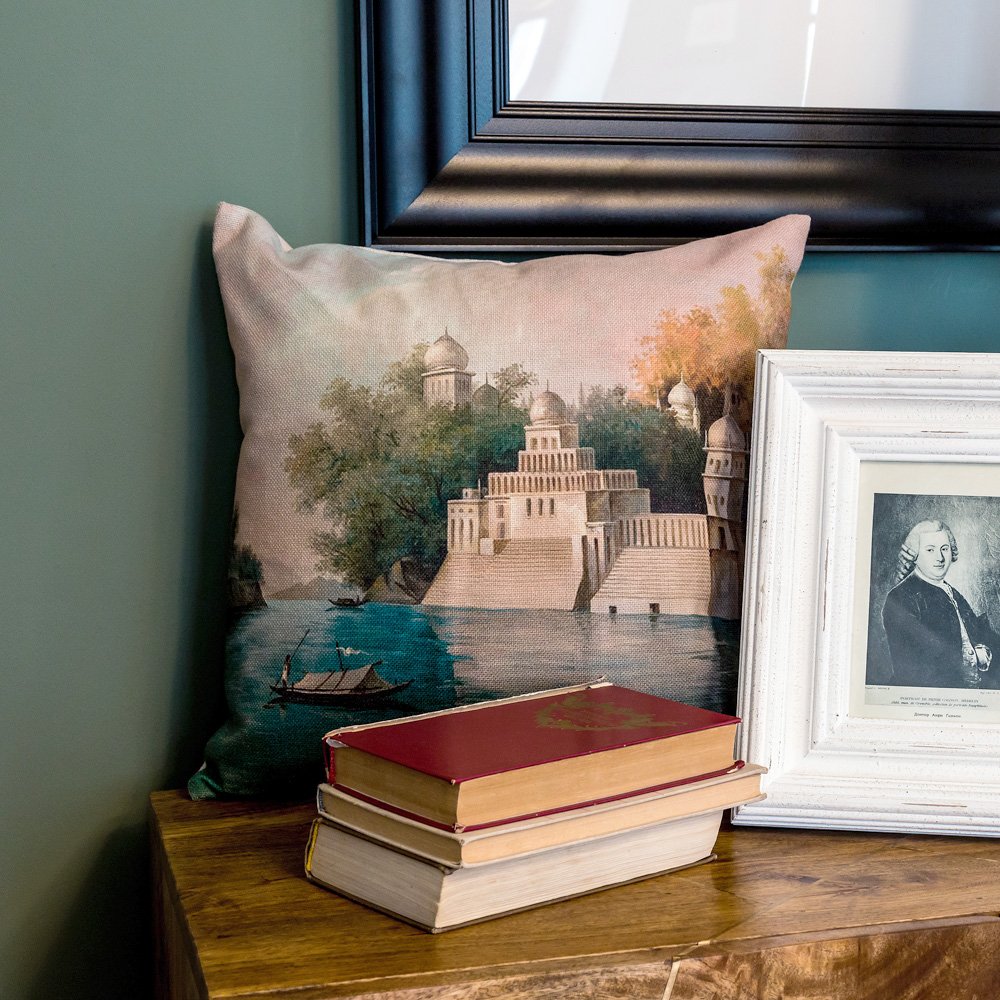 Комфортабельный отдых немыслим без отборных текстильных деталей. Вдыхая теплый эмоциональный настрой и раскрашивая дом романтикой экзотических путешествий, в быту они полезны и попросту приятны. Полуденный отдых и вечерний теле-досуг невозможны без мягкой уютной подушечки, особенно когда она украшена обаятельным живописным рисунком. Подушка раскрашена романтичным историческим пейзажем индийского города Чандрапур. Дизайн приоритетен домашним интерьерам, ведь Индия всегда славилась разноцветными тканями и живописными сюжетами.