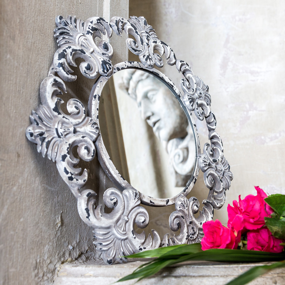 Размер рамы: 41×41×2 см Размер зеркала: Ø 20 см Вес: 0,77 кг Материалы: рама - металл, зеркало серебряной амальгамы Цвет: светлый серый антик с белой патиной Размер в упаковке: 42×42×3 см